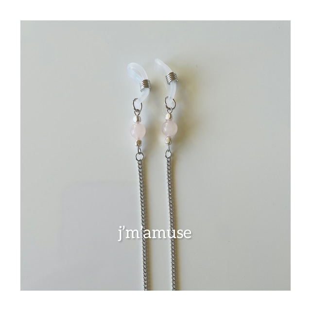 -     メガネチェーン ¥3,000 シンプルなメガネチェーン ピンクジェイドがポイントとなり、シルバーカラーのボールチェーンが素敵な印象です。 メガネのフレームにゴムのパーツを通したら、ゴムの真ん中の金具を上下してフレームにアジャストさせると外れにくいです。 長さ:約65cm 重さ:約9g