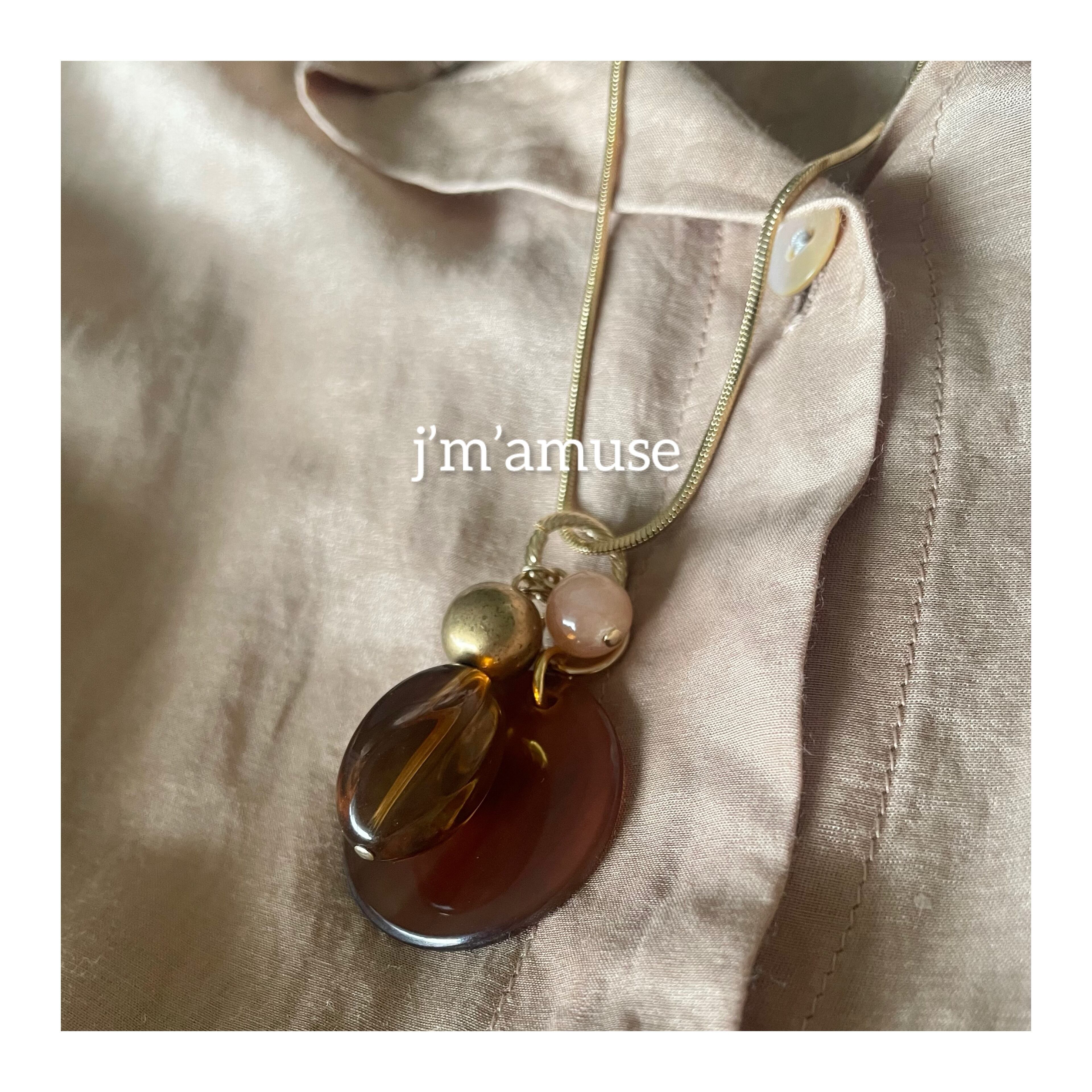 秋色のブラウンカラーに、ポイントでピンククォーツを使ったワンポイントネックレス。