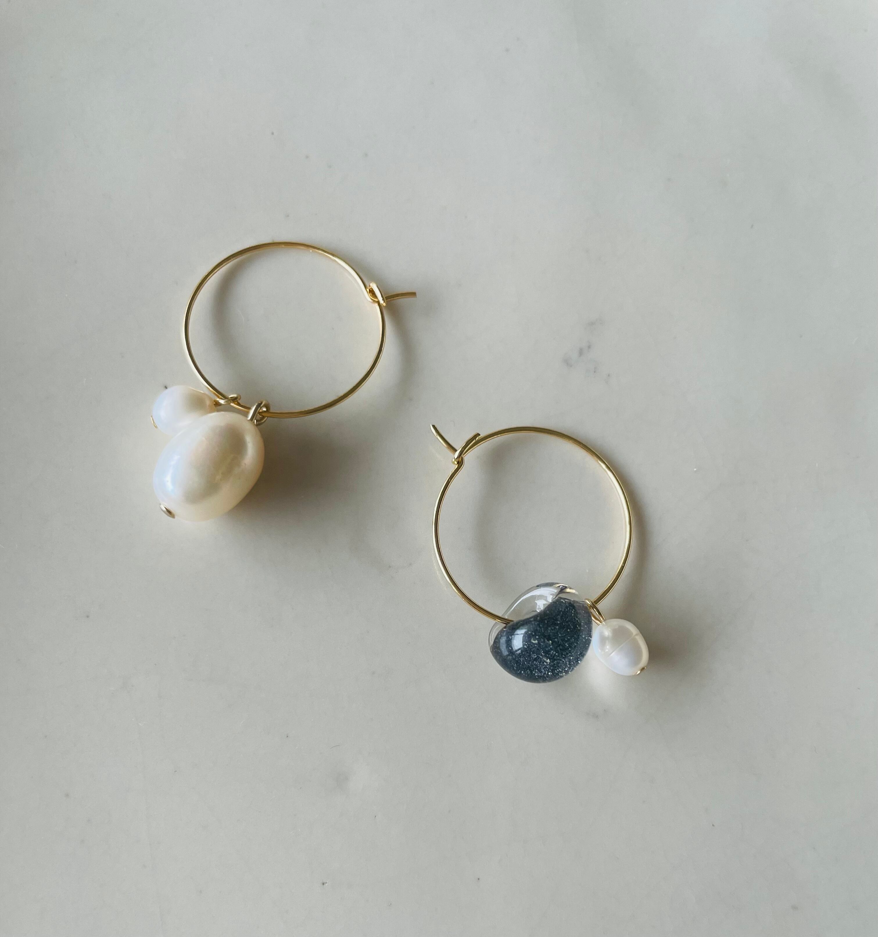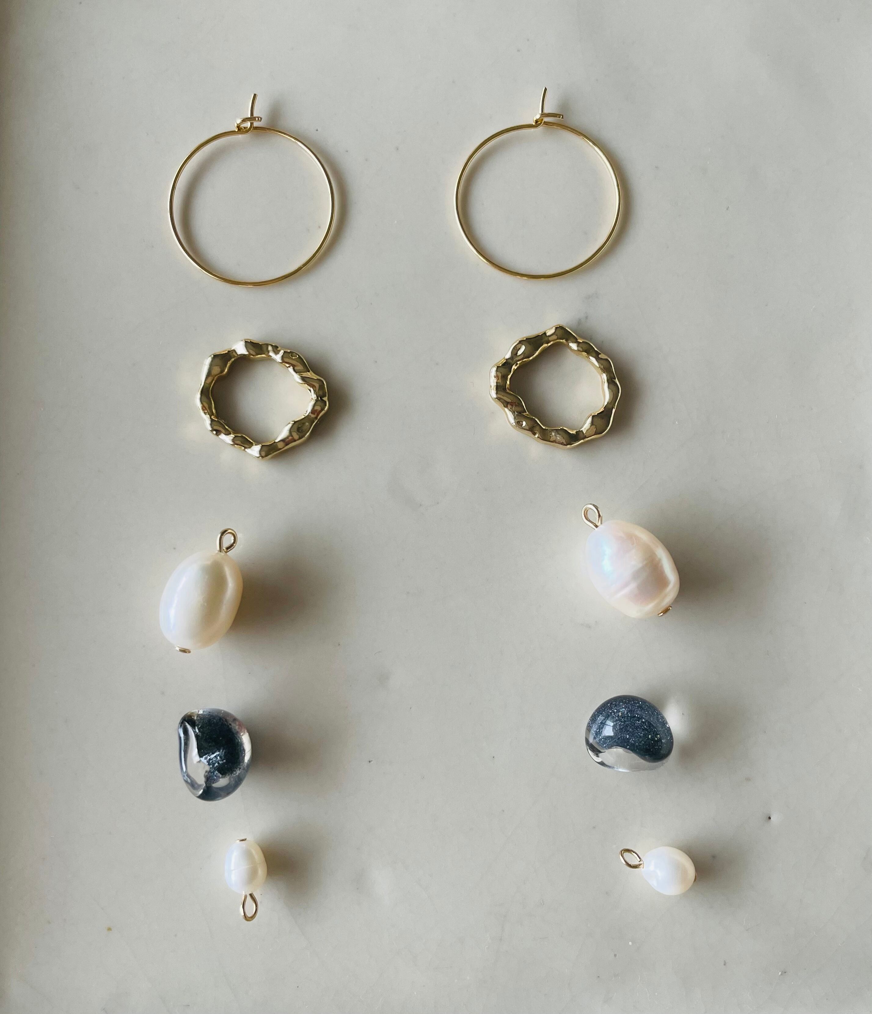フープピアスをベースに、淡水パール大、小、インポートガラスビーズ、メタルフープ(表、裏、表情違います)を、全部のせ(笑)から、お好みで。